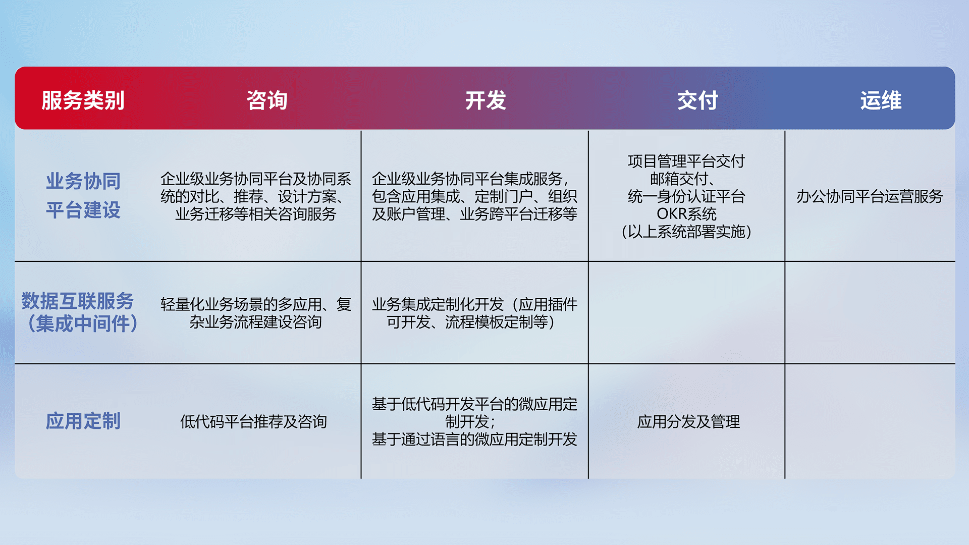 针对钉钉、、、、企微、、、IDaas等平台级产品提供产品的规划、、、、方案、、、交付、、定制化开发等服务,,实现如统一协同办公、、、智能客户服务、、、混合会议管理、、智能数据查询、、等业务场景,,,实现数字化转型。。。